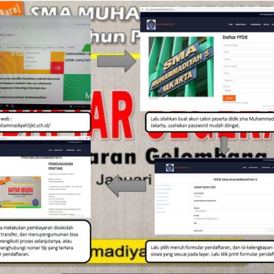 Alur Pendaftaran Sebagai Berikut :1. Calon siswa/wali melakukan pendaftaran untuk mendapatkan akun di sistem PPDB online di Halaman https://www.smamuhammadiyah5jkt.sch.id/ dengan