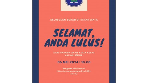 Sehubungan dengan telah selesainya masa pembelajaran Siswa/siswi SMA Muhammadiyah 5 Jakarta kelas 12 Tahun 2023/2024, kami mengumumkan melalui laman Website Link Klik Disini pada tanggal 06 Mei 2024 Pukul 10.00 WIB, Gunakan NISN yang tertera pada Kartu Ujian masing-masing, lalu cetak bukti Kelulusan untuk pengambilan Surat Keterangan Kelulusan, jika NISN kalian tidak terdaftar maka siswa yang bersangkutan masih belum bisa dinyatakan Lulus dari SMA Muhammadiyah 5 Jakarta.